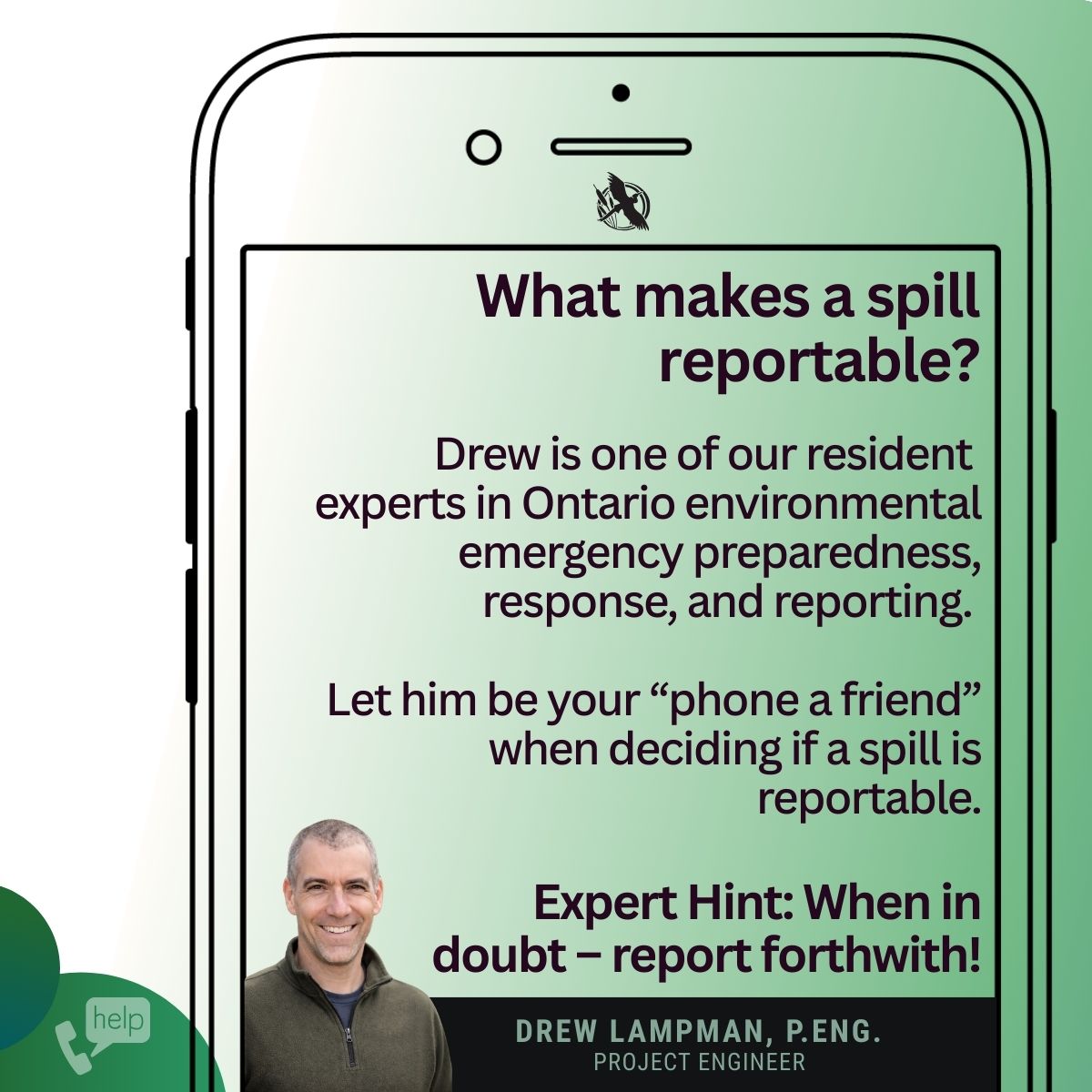 Drew Lampman, P.Eng. is one of our residents expert on Ontario environmental emergency preparedness, response and, in particular, reporting requirements. Let him be your “phone a friend” as you prepare your processes, or in the event of an incident that may be in the “grey zone”!